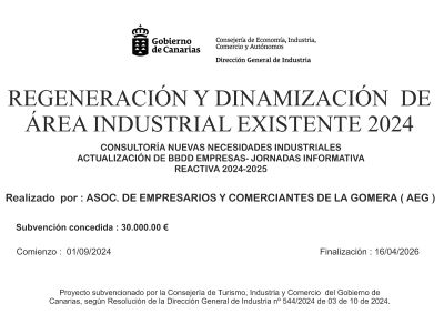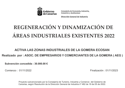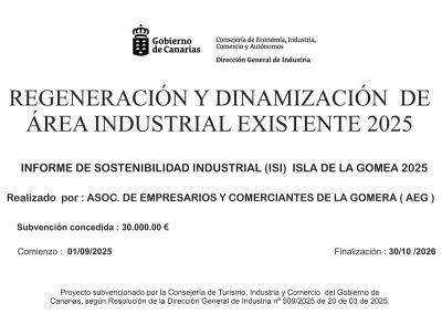 Es una iniciativa promovida por la Asociación de Empresarios de La Gomera (AEG), apoyada por la Red CIDE en la Cámara de Comercio de Santa Cruz de Tenerife y que cuenta con la subvención de la Consejería de Economía, Industria, Comercio y Conocimiento del Gobierno de Canarias, para la Dinamización de las áreas industriales de la Gomera.